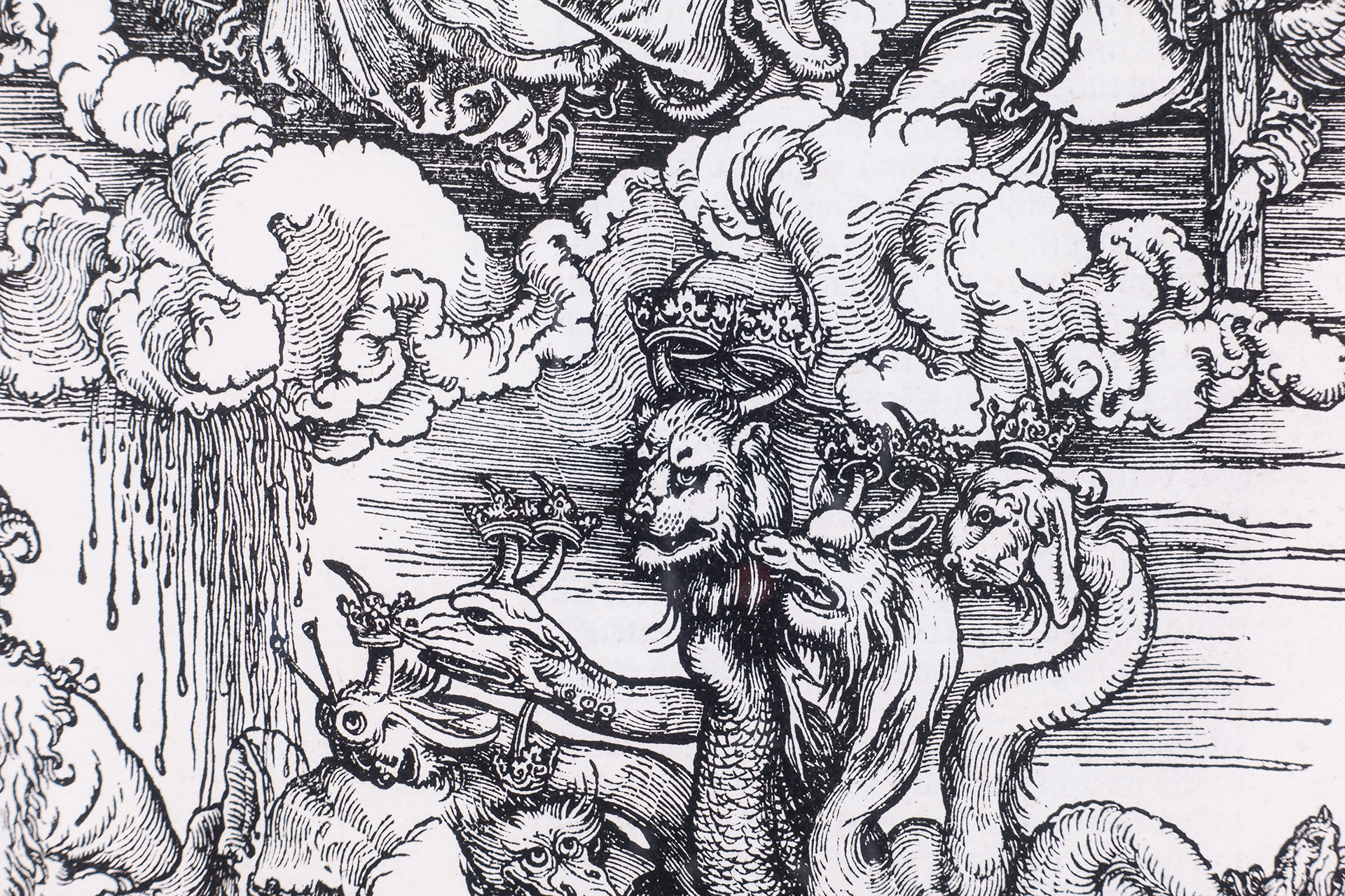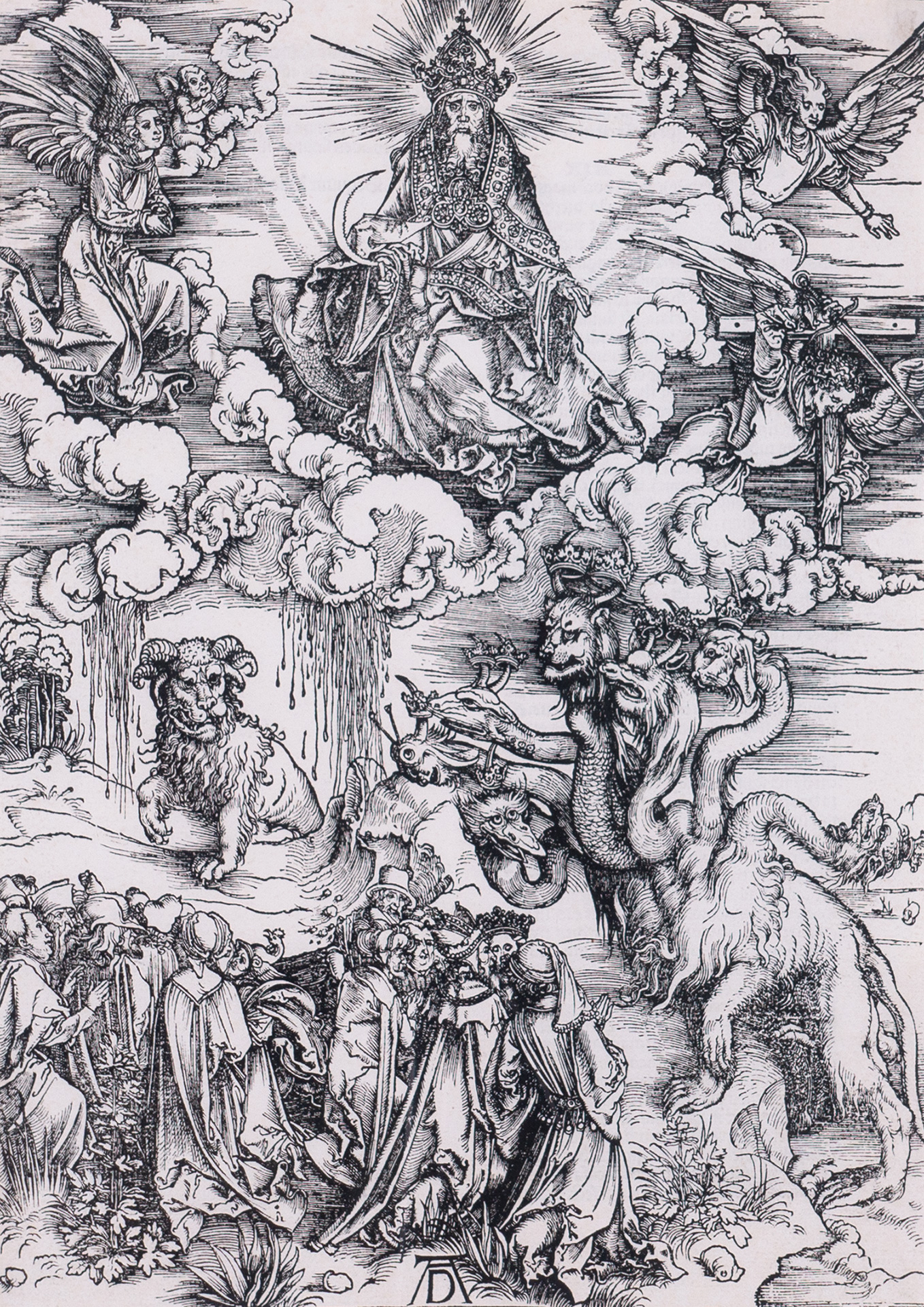 Dem himmlischen Jubel über den Sturz des Drachen (Blatt 10 der «Apokalypse») steht mit dem hier angebotenen Blatt der scheinbare Triumph der Tiere auf der Erde gegenüber. Der Drache übereignet seine Macht einem weiteren siebenköpfigen Ungeheuer, dem «Tier aus dem Meer». Ihm folgt das «Tier mit den Lammhörnern». Es vollbringt erstaunliche Wunder und verführt die Menschen dazu, «das erste Tier» anzubeten. Dürers Tier aus dem Meer ist ein Monstrum mit schlangenartig gewundenen Hälsen, die in sieben Köpfen münden (siehe Offb. 13,1-8). Entfernt erinnern sie an Ziegenbock, Löwe, Kaninchen, Schnecke, Schlange und Strauss – Tiere, die als Symbole menschlicher Laster und der sieben Todsünden gelten. Dem Kopf am rechten Bildrand wird von einem kreuztragenden Engel mit dem Schwert eine tödliche Wunde zugefügt, die aber wieder verheilt.