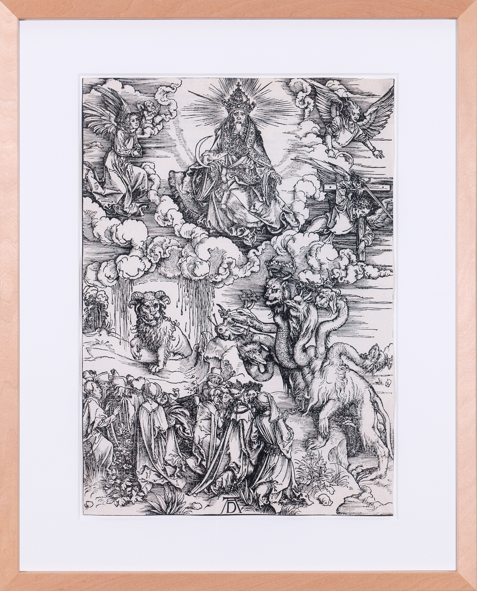 Ausgezeichneter Druck der lateinischen Textausgabe von 1511 mit an drei Seiten gut sichtbarem Plattenrand. Beim hier vorliegenden Holzschnitt «Tier mit den Lammhörnern» handelt es sich um das elfte Blatt aus der «Apokalypse»-Folge. Augenfällig ist ein siebenköpfiges Ungeheuer, welches aus dem Meer aufsteigt und von einer Menschenschar bestaunt wird.