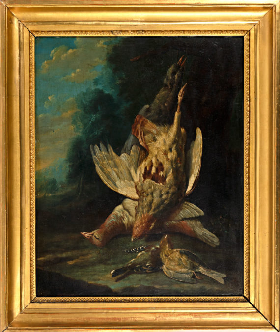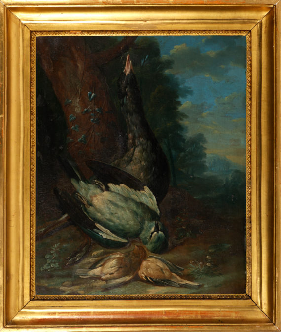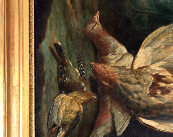 Die beiden sehr fein ausgeführten Jagdstilleben zeigen verschiedene europäische Vogelarten, darunter einen Auerhahn, Rebhühner sowie einen Eichelhäher. Die prachtvollen Landschaften im Hintergrund bilden eine eindrückliche Bühne für das Geschehen im Vordergrund. Seit dem 17. Jahrhundert wurden insbesondere in den Niederlanden sogenannte Tierstücke entworfen, welche Vögel verschiedenster Art in Geflügelhöfen oder vor prächtigen Landschaften zeigen – mal streitend und kämpfend – mal in friedvollem Miteinander. Die Darstellungen der Tiere spiegeln menschliches Handeln wieder, so wie es die antiken Tierfabeln taten. Stilistisch folgen die hier angebotenen Bilder der Entwicklung der niederländischen Malerei hin zu einem aristokratischen, raffinierten Geschmack in der zweiten Hälfte des 18. Jahrhunderts. Diesem Geschmack entsprechen die prachtvollen Landschaften in reichem Kolorit, mit dem das bunte und prachtvolle Gefieder hervorgehoben wird.