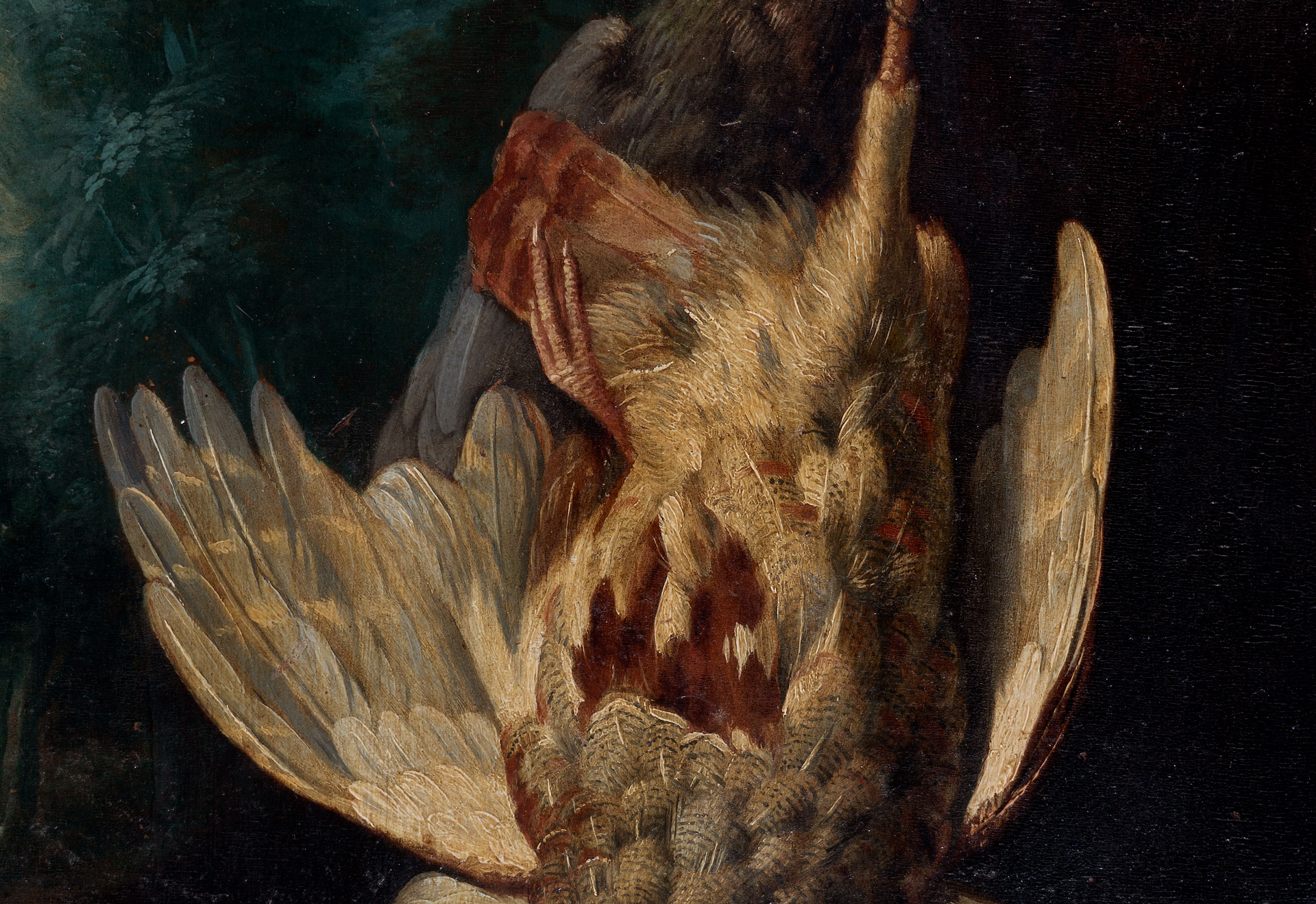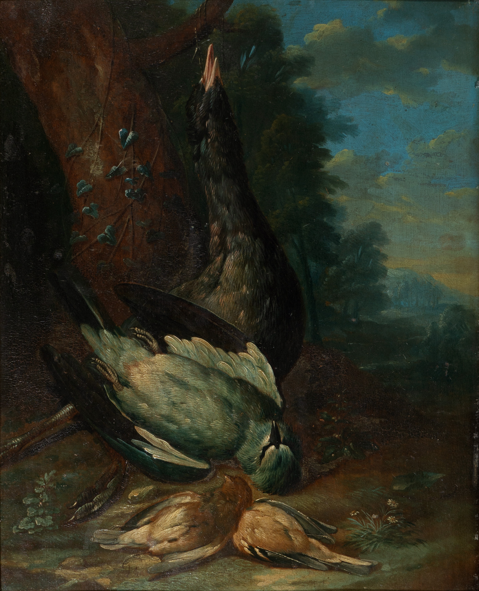 Die beiden sehr fein ausgeführten Jagdstilleben zeigen verschiedene europäische Vogelarten, darunter einen Auerhahn, Rebhühner sowie einen Eichelhäher. Die prachtvollen Landschaften im Hintergrund bilden eine eindrückliche Bühne für das Geschehen im Vordergrund. Seit dem 17. Jahrhundert wurden insbesondere in den Niederlanden sogenannte Tierstücke entworfen, welche Vögel verschiedenster Art in Geflügelhöfen oder vor prächtigen Landschaften zeigen – mal streitend und kämpfend – mal in friedvollem Miteinander. Die Darstellungen der Tiere spiegeln menschliches Handeln wieder, so wie es die antiken Tierfabeln taten. Stilistisch folgen die hier angebotenen Bilder der Entwicklung der niederländischen Malerei hin zu einem aristokratischen, raffinierten Geschmack in der zweiten Hälfte des 18. Jahrhunderts. Diesem Geschmack entsprechen die prachtvollen Landschaften in reichem Kolorit, mit dem das bunte und prachtvolle Gefieder hervorgehoben wird.
