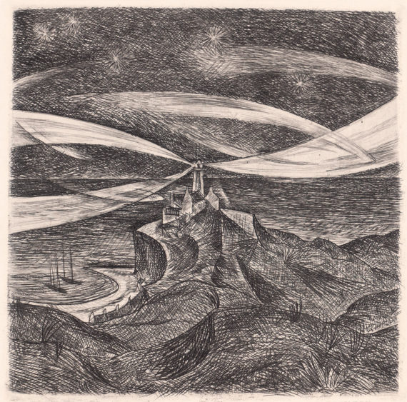 Das Gemälde «Leuchtturm mit rotierenden Strahlen» (1913) ist eines der bekanntesten Bilder von Paul Adolf Seehaus. Die vorliegende Druckgrafik besticht mit dem gleichen Motiv und gehört zu den gesuchtesten Werken des Künstlers. In einem Artikel der Frankfurter Zeitung zur Ausstellung «Rheinische Expressionisten» (Bonn, 1913) wird Seehaus als «die eigentliche Überraschung der Ausstellung, der als echtestes Malerblut unbedingt grosse Erwartungen weckt» bezeichnet. Das kleine Bild «Leuchtturm mit rotierenden Strahlen» wurde erstmals 1914 von Alfred Flechtheim ausgestellt, 1919 gab er es als Leihgabe an das damalige Bonner Stadtmuseum in der Villa Obernier, 1932 in eine Ausstellung im Kronprinzenpalais in Berlin. Danach wurde es «entartet» und schliesslich 1949 vom Bonner Kunstmuseum aus unklarem Besitz ersteigert. Im Jahr 2012 entschädigte das Museum die Erben Flechtheims.