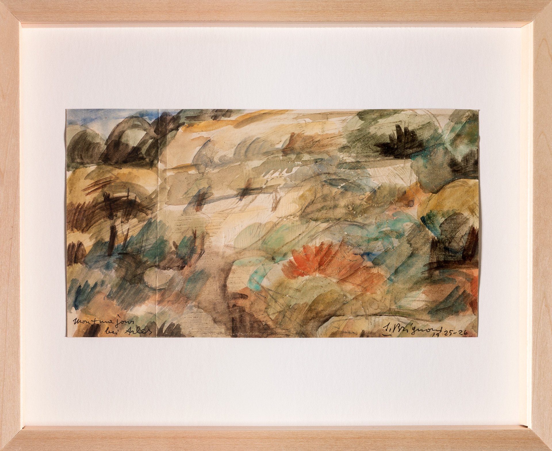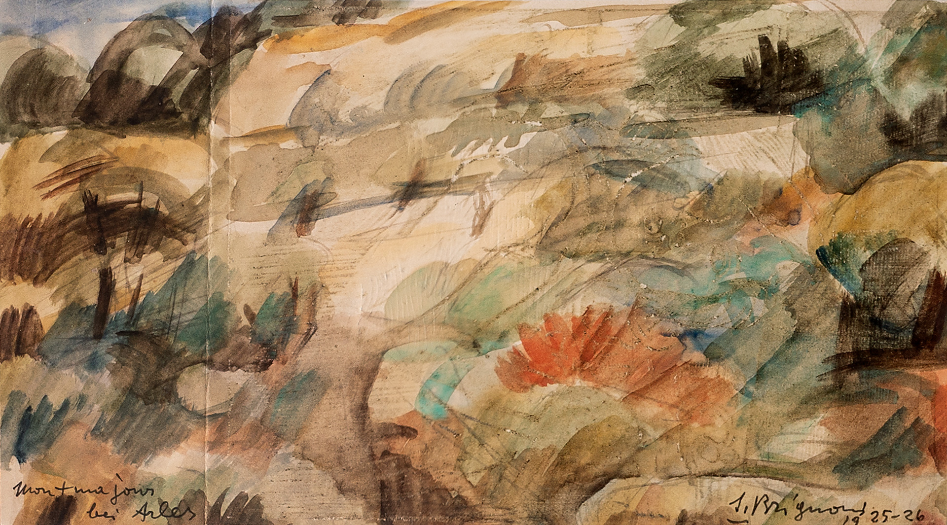 Zusammen mit dem Berner Künstler Max von Mühlenen verbringt Serge Brignoni 1925 drei Monate in Arles und drei weitere Monate in Sanary. Dort wandelt er gewissermassen auf den Spuren von Van Gogh und Cézanne, Matisse und Picasso. Dem vorliegenden Aquarell, auf dem Brignoni «mon plus beau jour» notiert, muss er am ländlichen Leben in der Provence besonderen Gefallen gefunden haben. Das seltene Aquarell besticht durch gekonnt gesetzte Pinselstriche in den von ihm, bevorzugten Farbflecken grün-blau-rot. «Die Volumen der Landschaftsbildenden Elemente – die er in analoger Weise, aber statischer, schon früher in den Aquarellen von Bellinzona bezonz hat –, werden in ihrem Inneren dynamisiert und gehen damit über die Lehre Cézannes hinaus» (Steffan Biffiger/Manuela Kahn-Rossi, Serge Brignoni, Bern 2003, S. 27).
