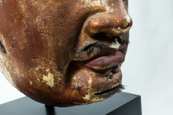Eine ausserordentlich expressiv gearbeitete Ming-Skulptur, welche in ihrer überlebensgrossen Form ursprünglich als Türwächter vor einem buddhistischen Tempel gestanden hat. Dargestellt wird die Gottheit Vajrapani, einer der wichtigsten Beschützer der buddhistischen Lehre und des Gesetzes. Stilistisch ist die Arbeit verwandt mit dem König des Westens, Lokapala Virupaksha. In Stuck modelliert – mit übertriebenen Gesichtszügen, Haareinsatz und Glasaugen – beeindruckt der Wächter durch sein verzerrtes Gesicht und seinem furchterregenden Blick. Der geschlossene Mund symbolisiert die Sanskrit-Silbe «Ah» und ähnelt den griechischen «Omega». In der originalen Bemalung, was sehr selten ist.