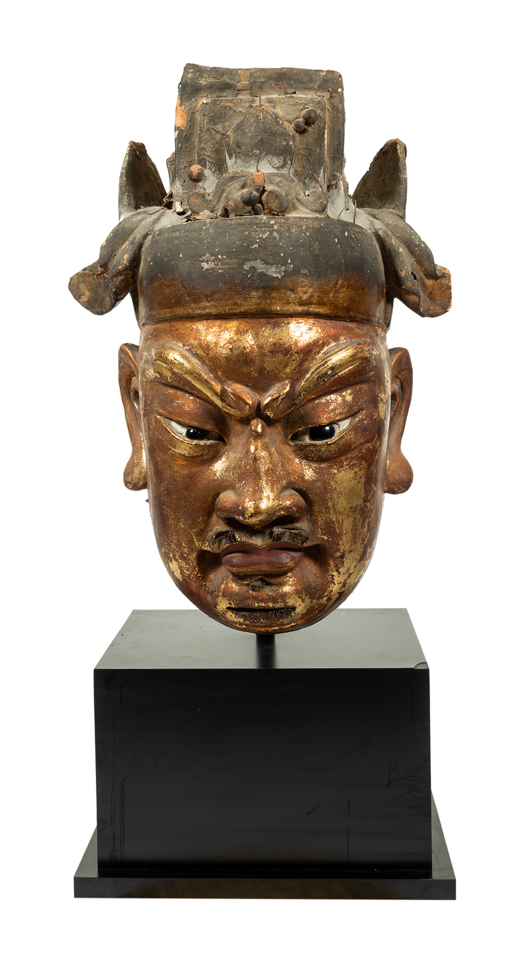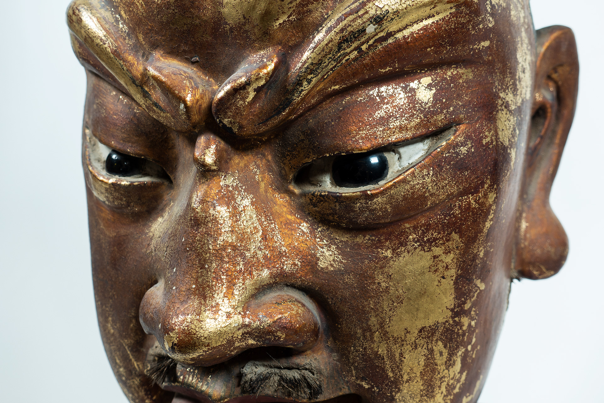 Eine ausserordentlich expressiv gearbeitete Ming-Skulptur, welche in ihrer überlebensgrossen Form ursprünglich als Türwächter vor einem buddhistischen Tempel gestanden hat. Dargestellt wird die Gottheit Vajrapani, einer der wichtigsten Beschützer der buddhistischen Lehre und des Gesetzes. Stilistisch ist die Arbeit verwandt mit dem König des Westens, Lokapala Virupaksha. In Stuck modelliert – mit übertriebenen Gesichtszügen, Haareinsatz und Glasaugen – beeindruckt der Wächter durch sein verzerrtes Gesicht und seinem furchterregenden Blick. Der geschlossene Mund symbolisiert die Sanskrit-Silbe «Ah» und ähnelt den griechischen «Omega». In der originalen Bemalung, was sehr selten ist.